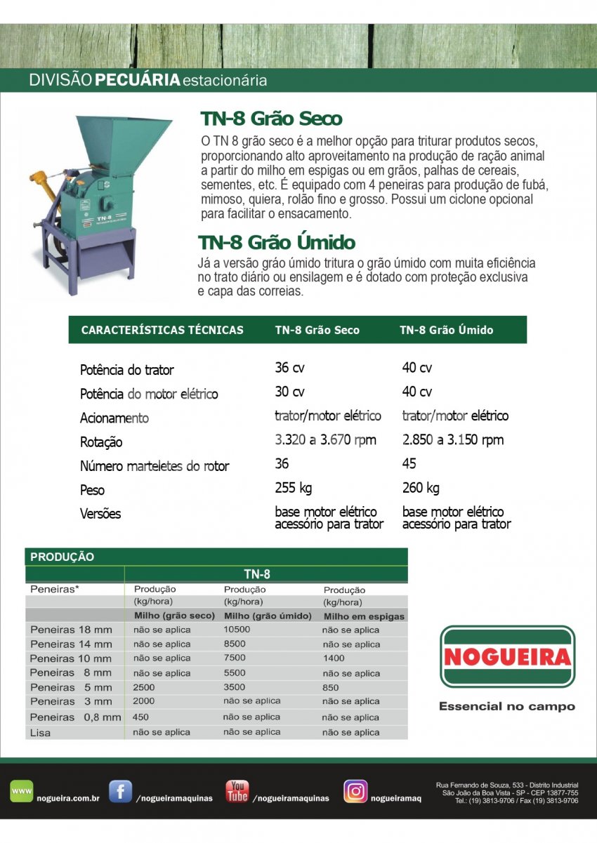 O TN 8 grão seco é a melhor opção para triturar produtos secos, proporcionando alto aproveitamento na produção de ração animal a partir do milho em espigas ou em grãos, palhas de cereais, sementes, etc. É equipado com 4 peneiras para produção de fubá, mimoso, quirera, rolão fino e grosso. Possui um ciclone opcional para facilitar o ensacamento.