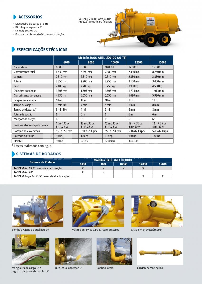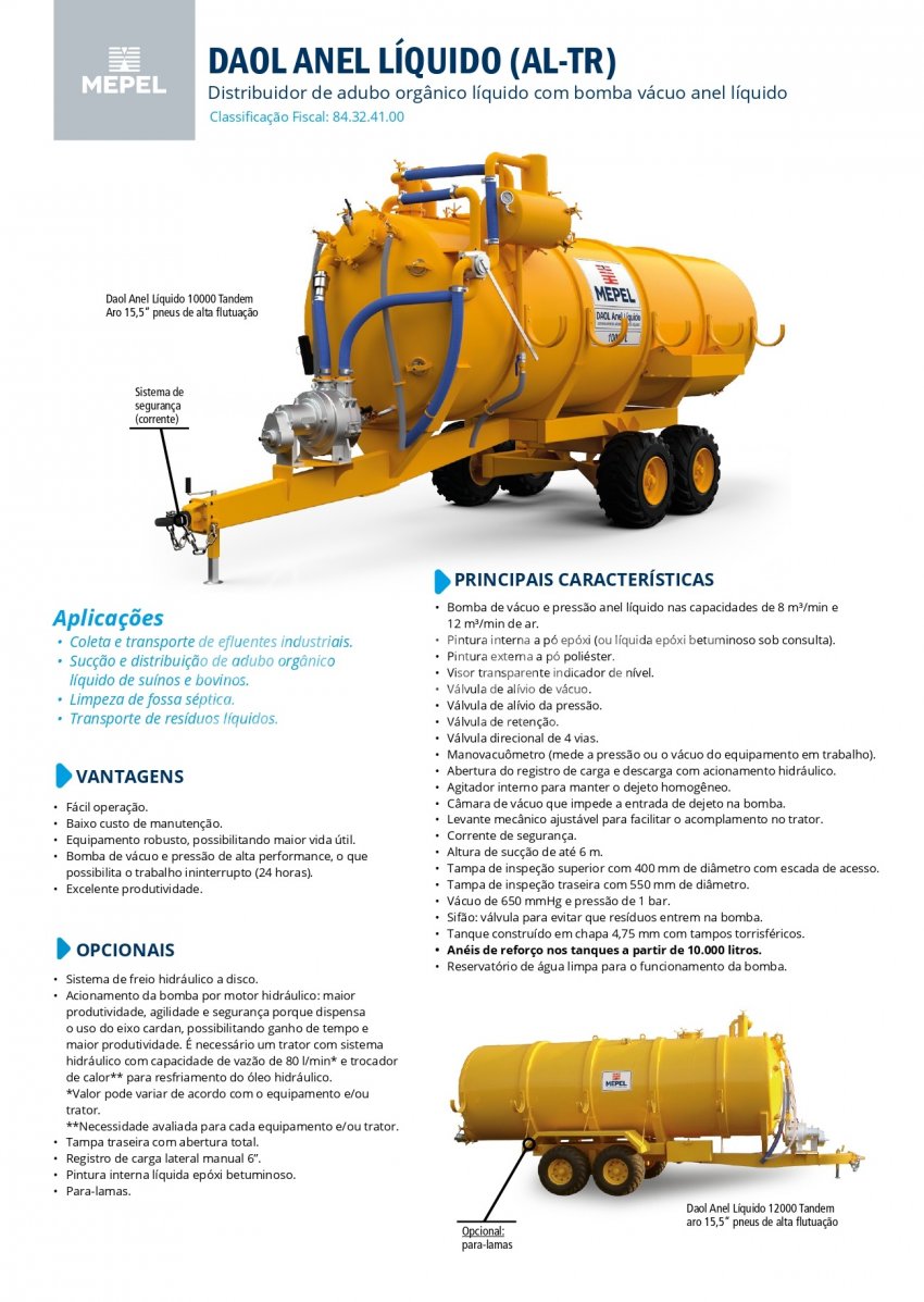 É um tanque distribuidor ideal para transporte de efluentes industriais, além de ser muito eficiente também para sucção e distribuição de adubo orgânico líquido de suínos e bovinos, limpeza de fossas e transporte de resíduos líquidos.