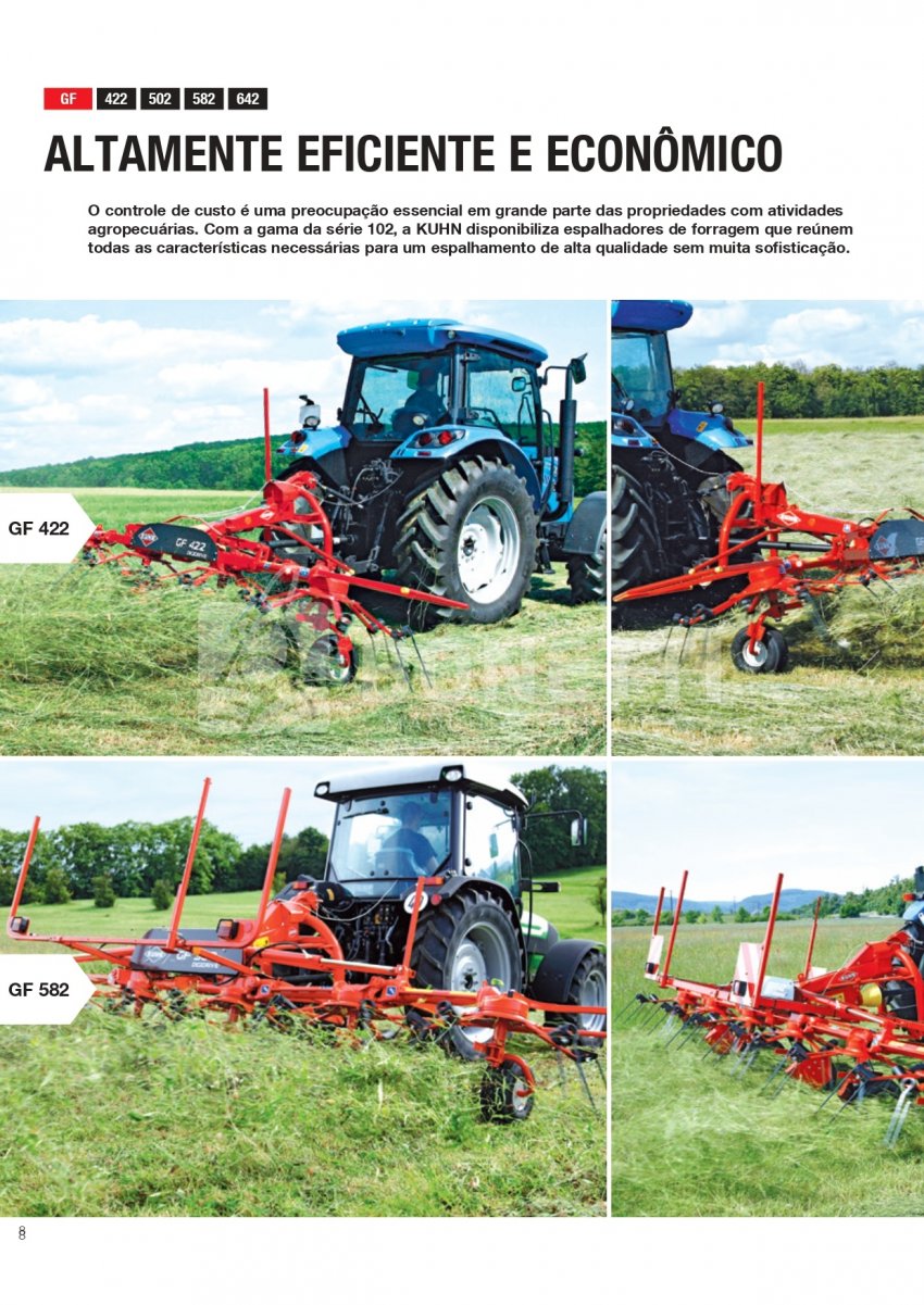 Os espalhadores GF 102 são máquinas simples e eficazes com 4 ou 6 rotores e larguras de trabalho de 4,22 a 6,40 m. O controle de custo é uma questão essencial em muitas fazendas.