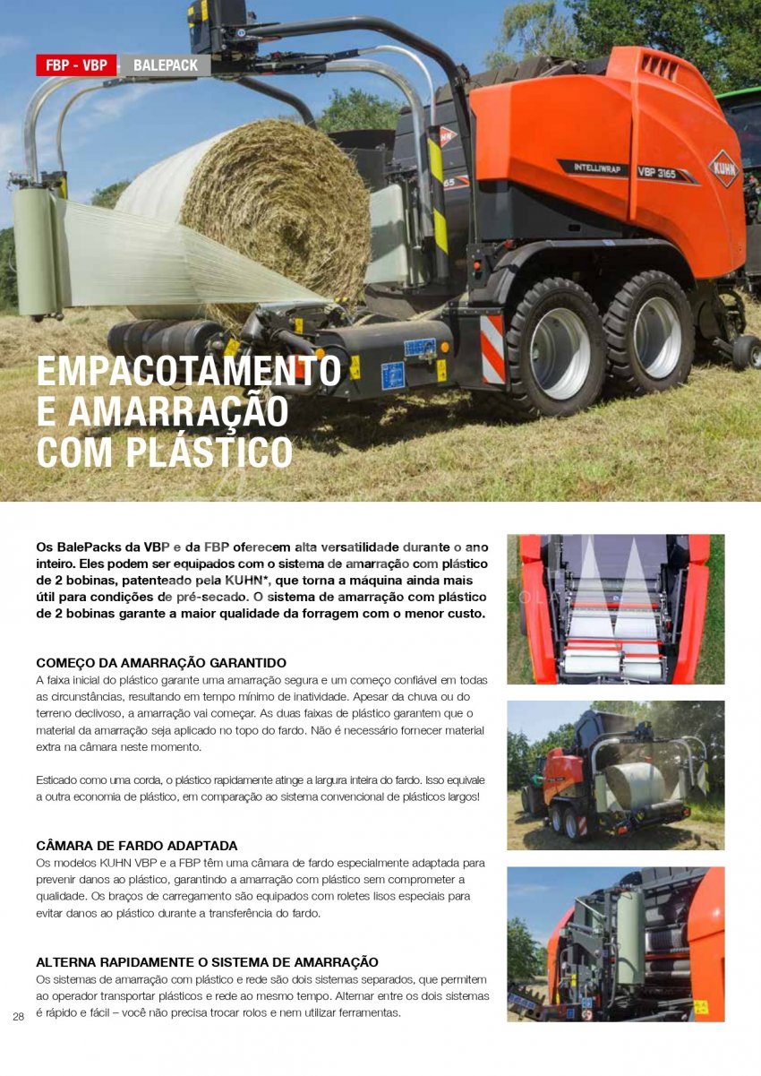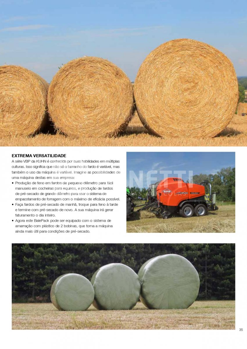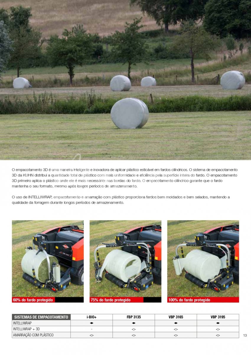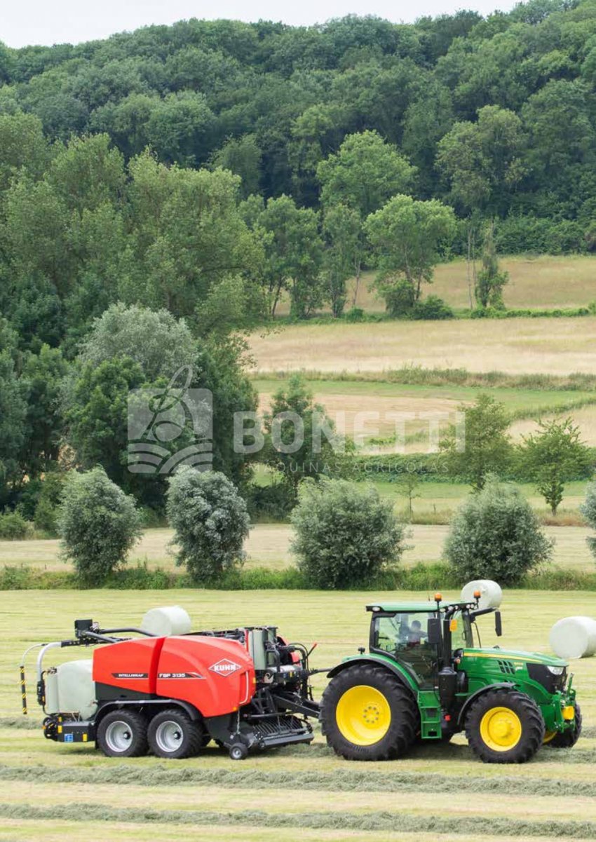 A Série KUHN VBP 3100 foi projetada para funcionar em uma ampla variedade de forragens. A transferência rápida e confiável de fardos, combinada com uma unidade de empacotamento de satélite duplo de alta velocidade, equipada com sistema 3D e INTELLIWRAP, oferece a KUHN VBP a possibilidade de otimizar o empacotamento para cada condição de trabalho, oferecendo máxima flexibilidade. Fardos densos e com formato perfeito são produzidos pela câmara de fardos PROGRESSIVE DENSITY.