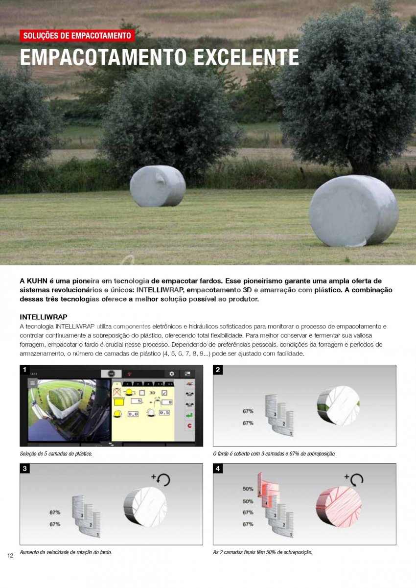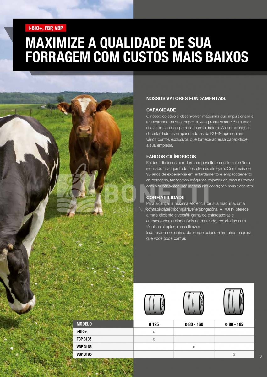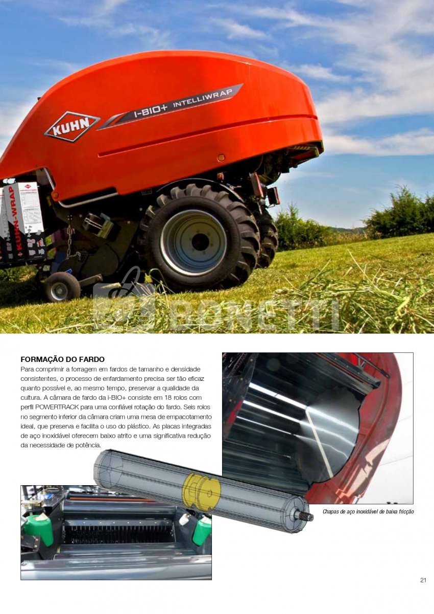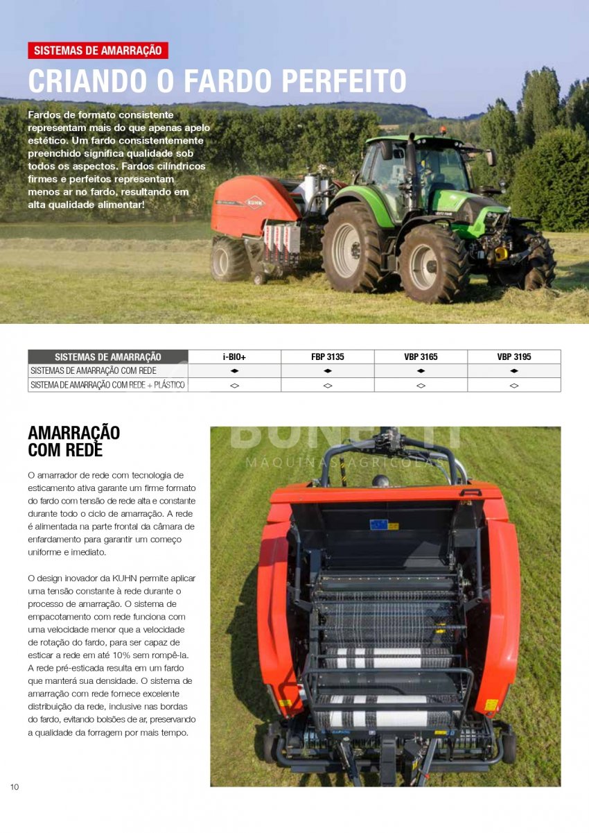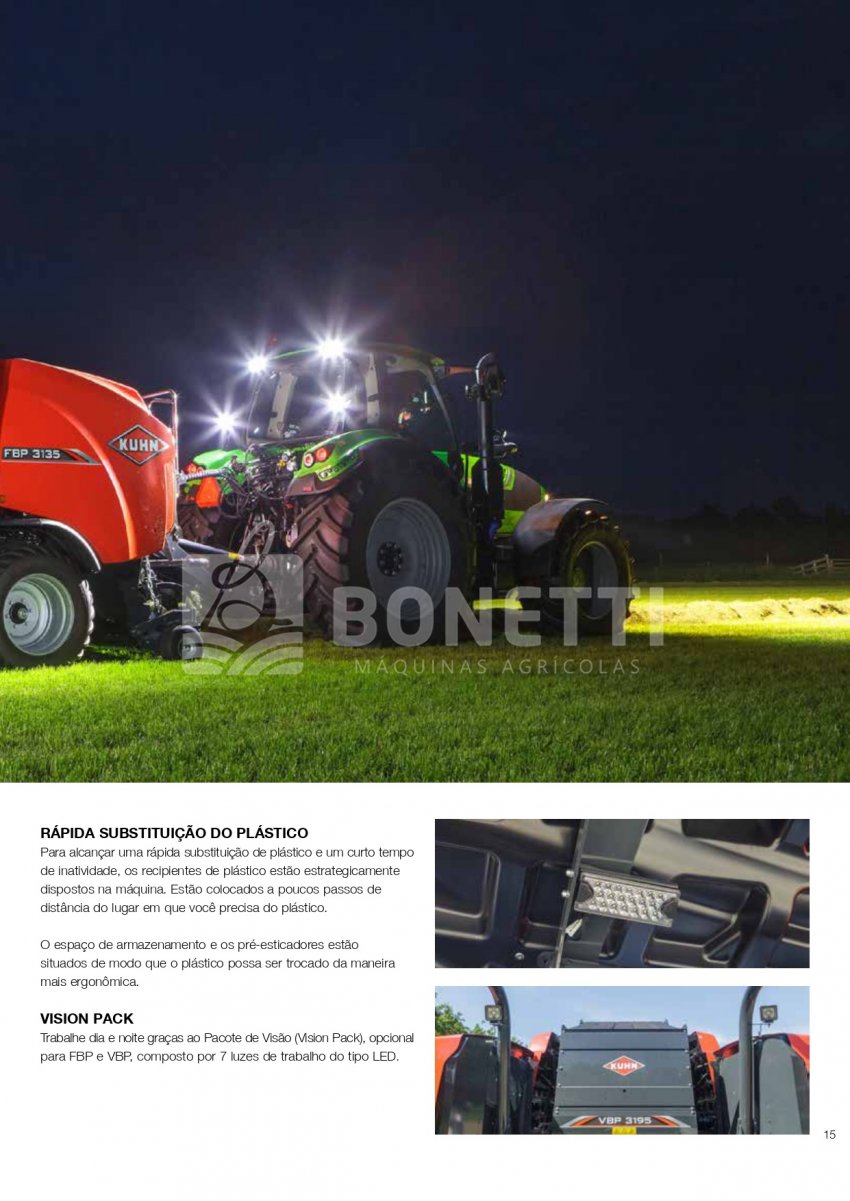 A Série KUHN VBP 3100 foi projetada para funcionar em uma ampla variedade de forragens. A transferência rápida e confiável de fardos, combinada com uma unidade de empacotamento de satélite duplo de alta velocidade, equipada com sistema 3D e INTELLIWRAP, oferece a KUHN VBP a possibilidade de otimizar o empacotamento para cada condição de trabalho, oferecendo máxima flexibilidade. Fardos densos e com formato perfeito são produzidos pela câmara de fardos PROGRESSIVE DENSITY.