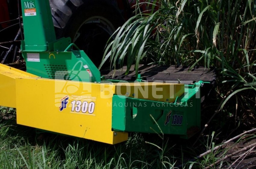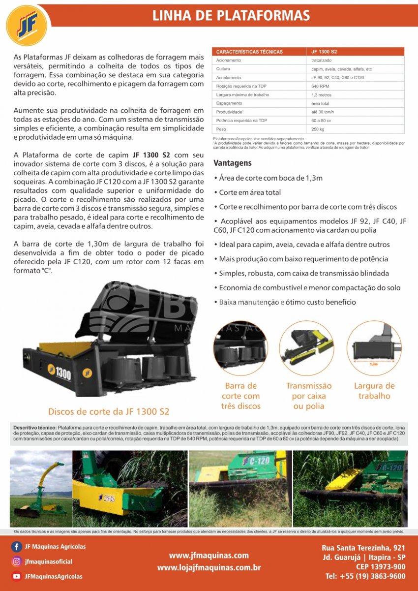 Descritivo técnico: Plataforma para corte e recolhimento de capim, trabalho em área total, com largura de trabalho de 1,3m, equipado com barra de corte com três discos de corte, lona de proteção, capas de proteção, eixo cardan de transmissão, caixa multiplicadora de transmissão, polias de transmissão, acoplável às colhedoras JF90, JF92, JF C40, JF C60 e JF C120 com transmissões por caixa/cardan ou polia/correia, rotação requerida na TDP de 540 RPM, potência requerida na TDP de 60 a 80 cv (a potência depende da máquina a ser acoplada).