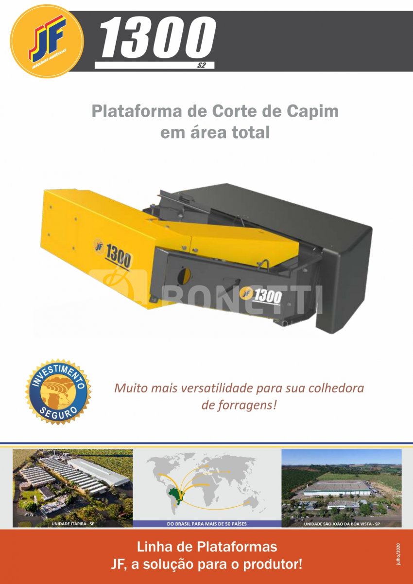 A Plataforma de corte de capim JF 1300 S2 com seu inovador sistema de corte com 3 discos, é a solução para colheita de capim com alta produtividade e corte limpo das soqueiras. A combinação JF C120 com a JF 1300 S2 garante resultados com qualidade superior e uniformidade do picado. O corte e recolhimento são realizados por uma barra de corte com 3 discos e transmissão segura, simples e para trabalho pesado, é ideal para corte e recolhimento de capim, aveia, cevada e alfafa dentre outros.