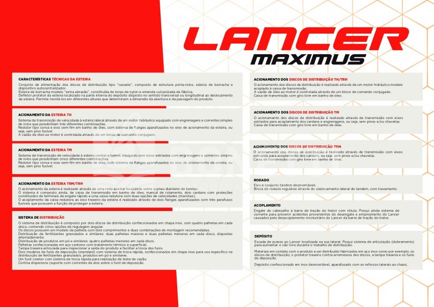A linha LANCER MAXIMUS oferece condições para um excelente perfil e largura de distribuição de corretivos, fertilizantes e sementes. Preparado para receber taxa variável, otimizando ainda mais a aplicação, sem desperdícios. Maior autonomia do mercado.
