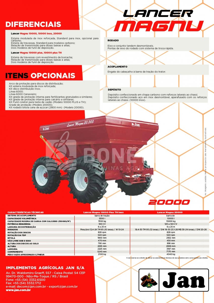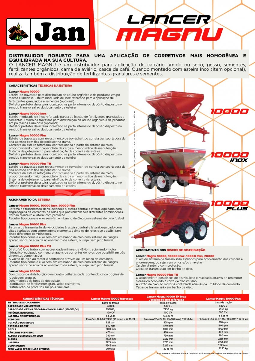 O LANCER MAGNU é um distribuidor para a aplicação de calcário úmido ou seco, gesso, sementes, fertilizantes orgânicos, cama de aviário, casca de café. Fertilizantes granulares e sementes, quando montada com esteira inox (opcional).