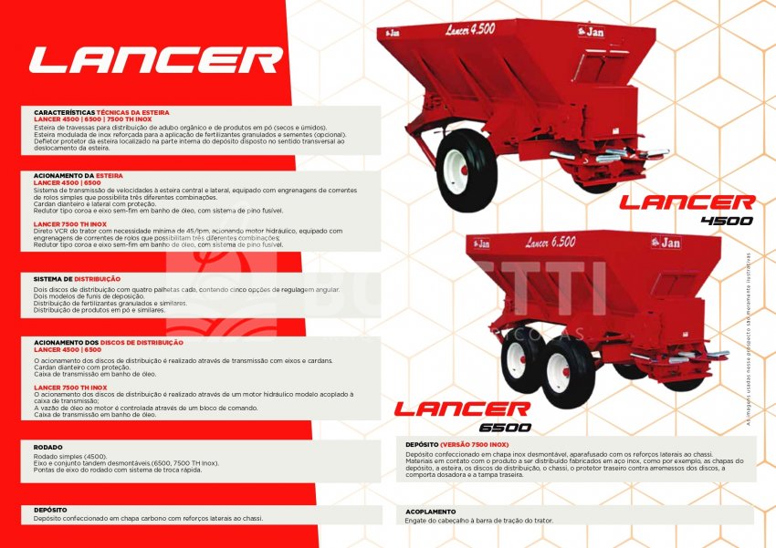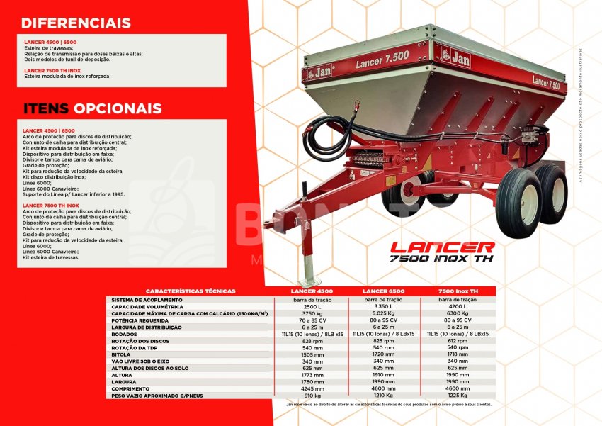 O LANCER 4500 é um distribuidor polivalente adequado para pequenas, médias e grandes lavouras, é capaz de executar com perfeição a aplicação de calcário úmido ou seco, sementes, fertilizantes minerais e orgânicos, cama de aviário, casca de café, gesso, entre outros.