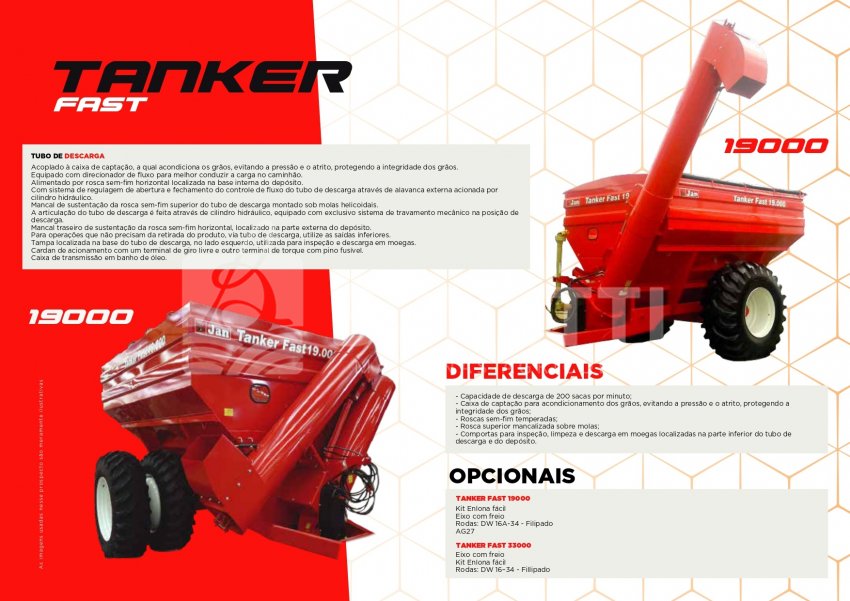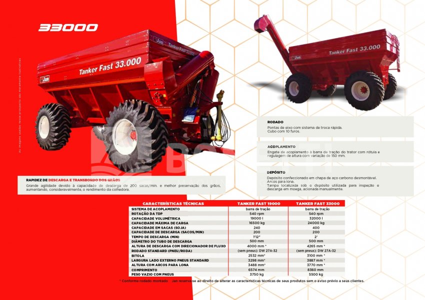 Grande agilidade devido à capacidade de descarga de 200 sacas/min. e melhor preservação dos grãos, aumentando, consideravelmente, o rendimento da colhedora.