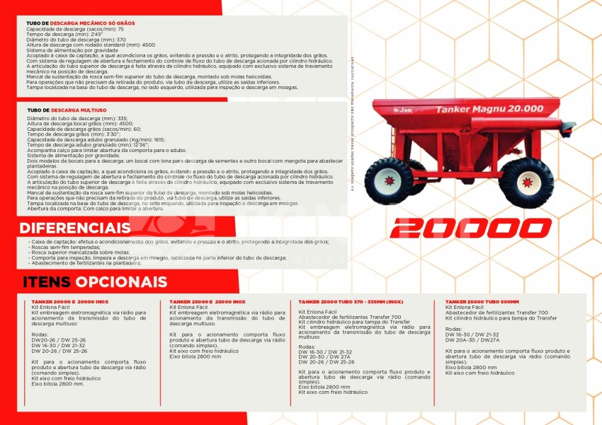 Conta com depósito em inox e tubo multiuso. Agiliza também no momento plantio com o abastecimento de fertilizantes na plantadeira. Realiza o transporte e transbordo seguro e eficiente dos grãos na hora da colheita, aumentando o rendimento da colhedora em até 25%.
