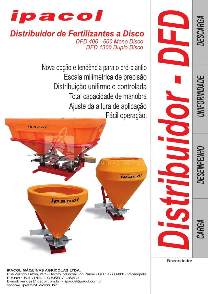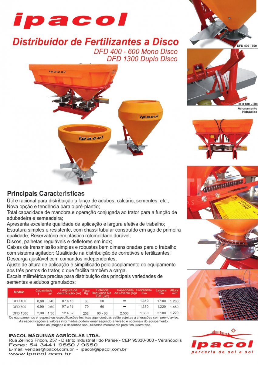 O distribuidor de fertilizantes a disco da Ipacol possui função de adubadeira e semeadeira Descarga ajustável com comandos duplos Estrutura simples e resistente, com chassi tubular Baixo desgaste e baixo consumo de combustível Baixo custo de manutenção