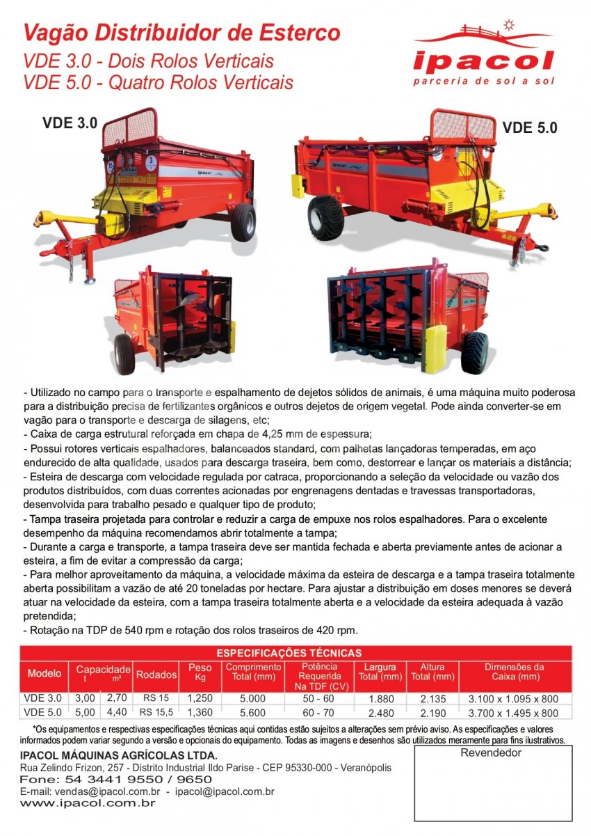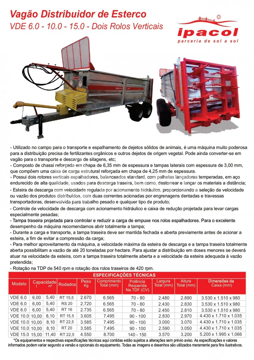 O vagão distribuidor de esterco dois rolos verticais da IPACOL é utilizado no campo para o transporte e espalhamento de dejetos sólidos de animais, é uma máquina muito poderosa para a distribuição precisa de fertilizantes orgânicos e outros dejetos de origem vegetal. Pode ainda converter-se em vagão para o transporte e descarga de silagens e outros.