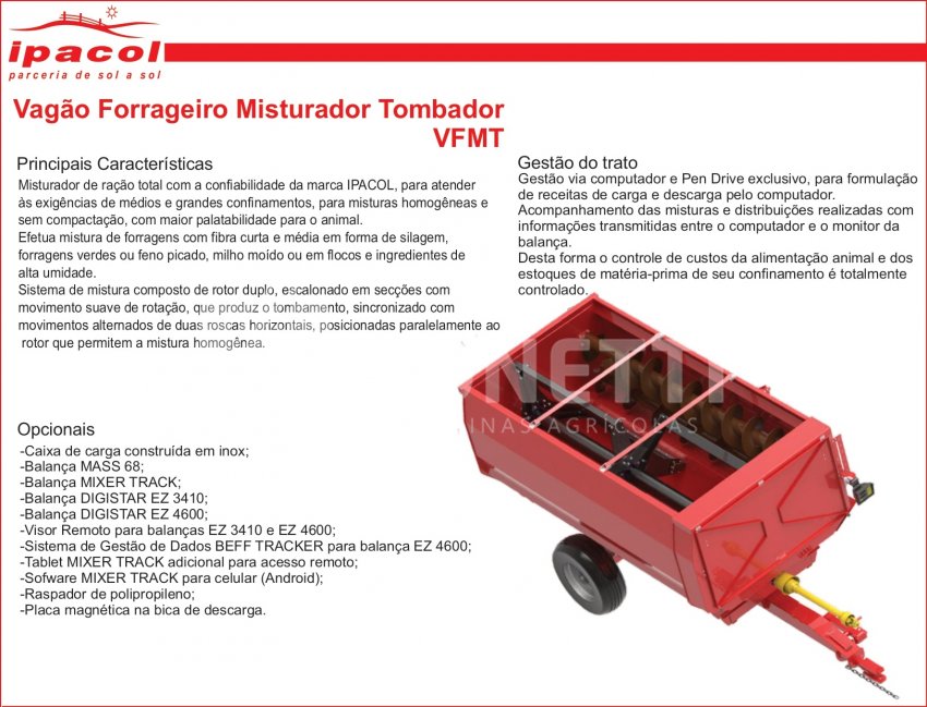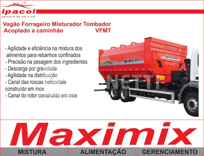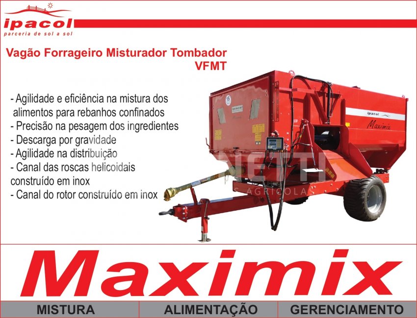 O Vagão Forrageiro Misturador Tombador da IPACOL oferece agilidade e eficiência na mistura dos alimentos para rebanhos confinados, alta produtividade, robustez e mistura perfeita.