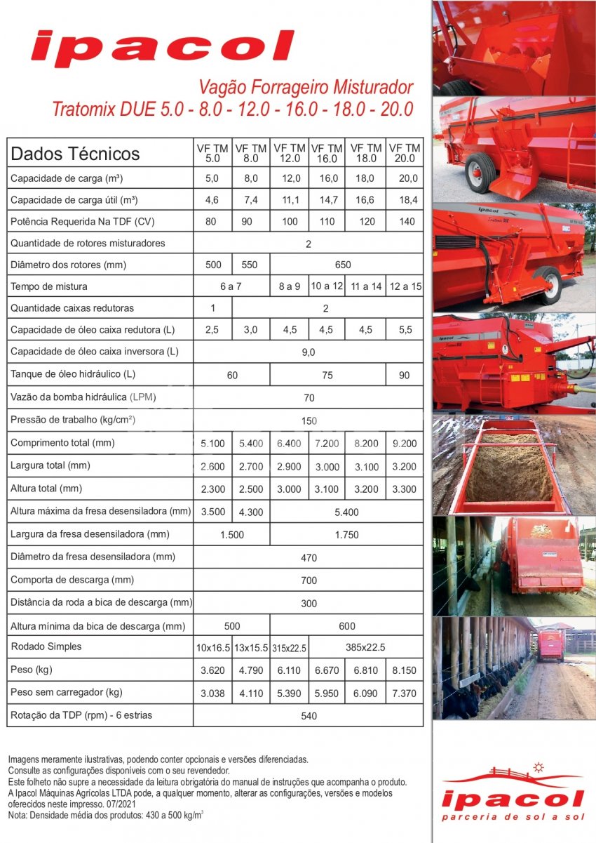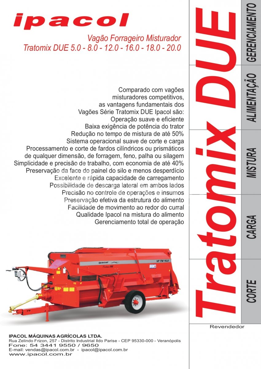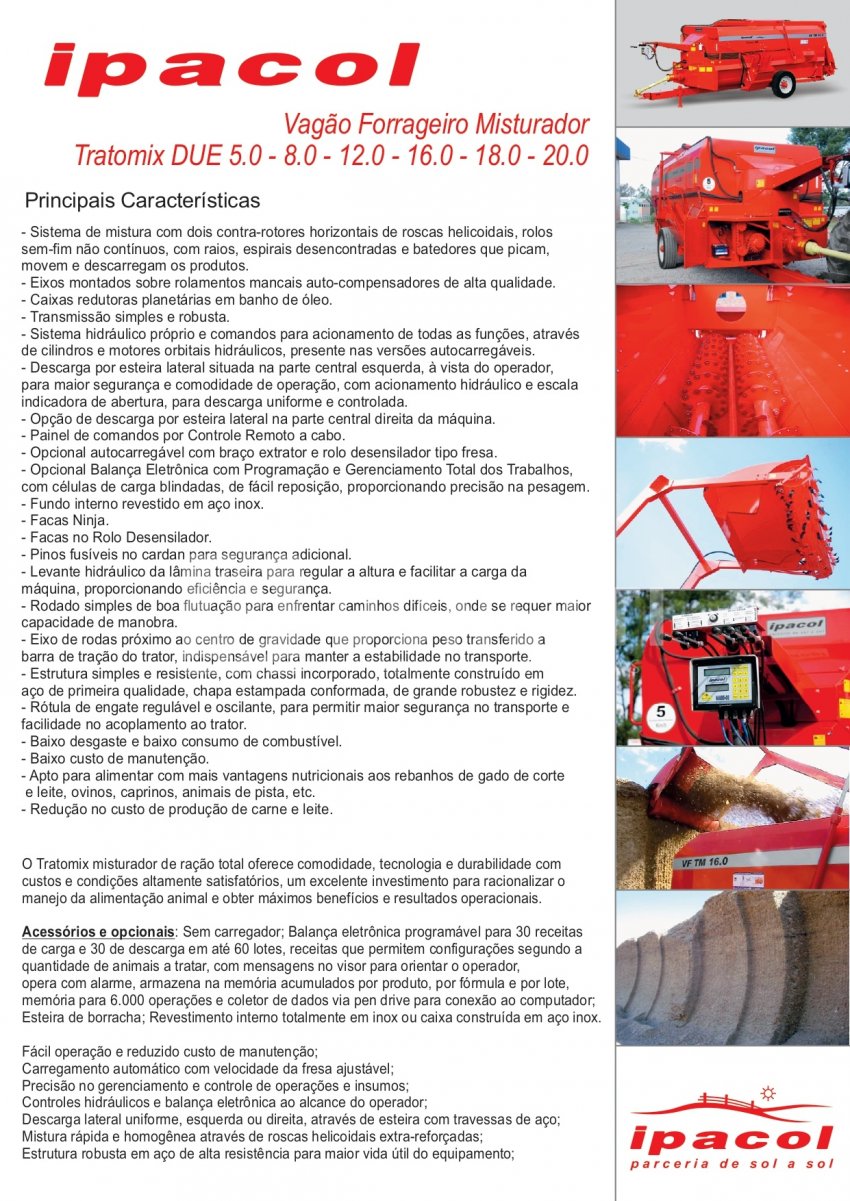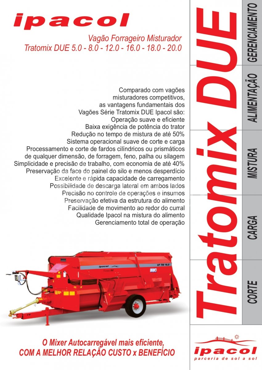 O Vagão Forrageiro Misturador Tratomix DUE oferece rapidez no carregamento, com baixa potência requerida,excelente capacidade de carga,desensilagem sauve e precisa, preservação da estrutura do alimento, ótima e consistente qualidade na mistura, descarga lateral uniforme e rápida para ambos os lados, redução no tempo de mistura de até 50%, processamento e corte de fardos cilíndricos ou prismáticos de qualquer dimensão, de forragem, feno, palha ou silagem gerenciamento de operação.