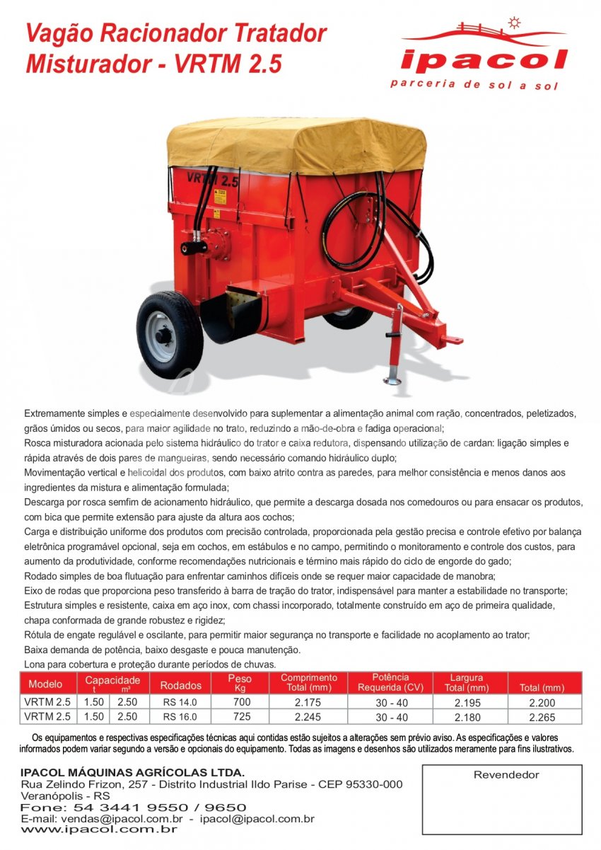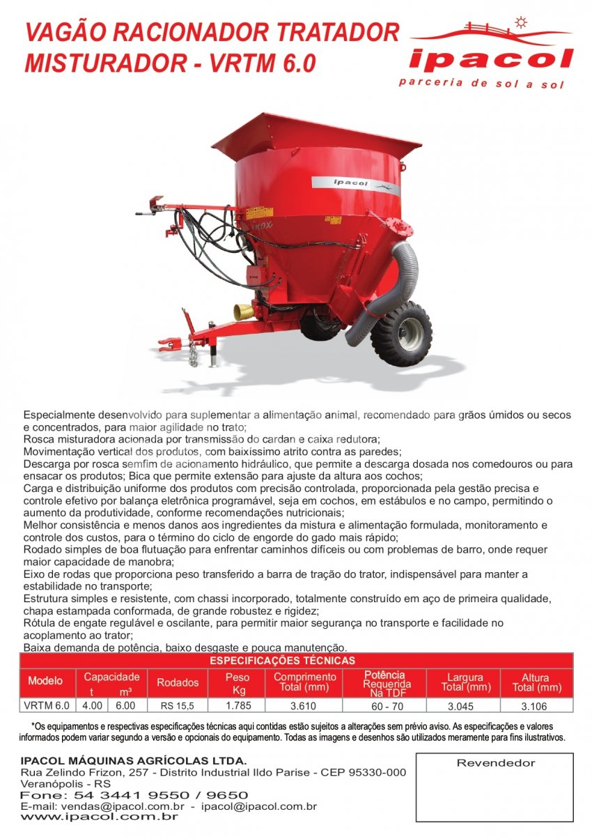 O vagão racionador tratador misturador da Ipacol é extremamente simples e especialmente desenvolvido para suplementar a alimentação animal com ração, concentrados, peletizados, grãos úmidos ou secos, para maior agilidade no trato, reduzindo a mão-de-obra e fadiga operacional.