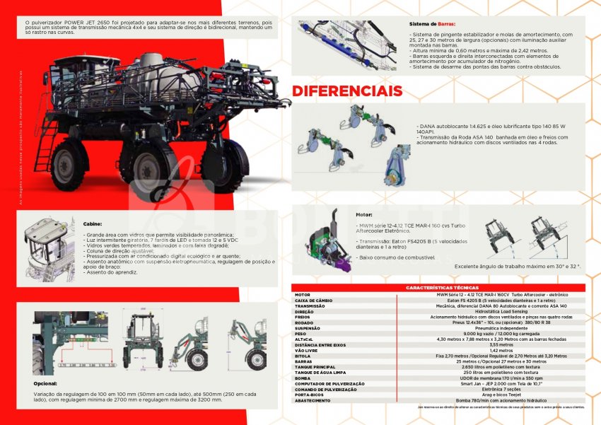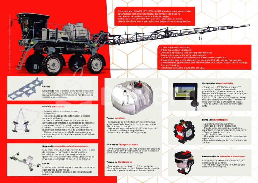 O POWER JET 2650 foi projetado para adaptar-se em diferentes terrenos. Possui sistema de transmissão mecânica 4x4 e sistema de direção bidirecional, com opções de alcance de 25, 27 e 30 metros de largura, fazendo uma pulverização precisa, de forma homogênea, ágil e econômica.